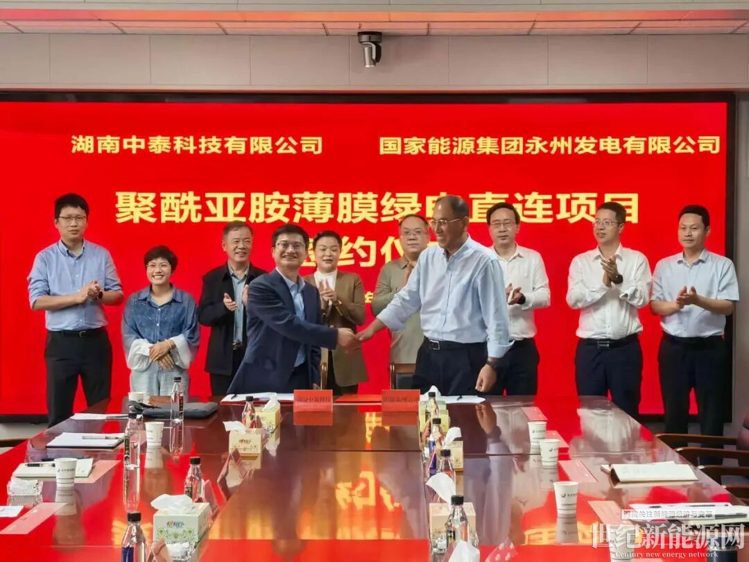 自“永州陆港”微信公众号获悉,4月9日,湖南中泰科技有限公司与国家能源集团永州发电有限公司在永州陆港举行聚酰亚胺薄膜绿电直连项目签约仪式。
