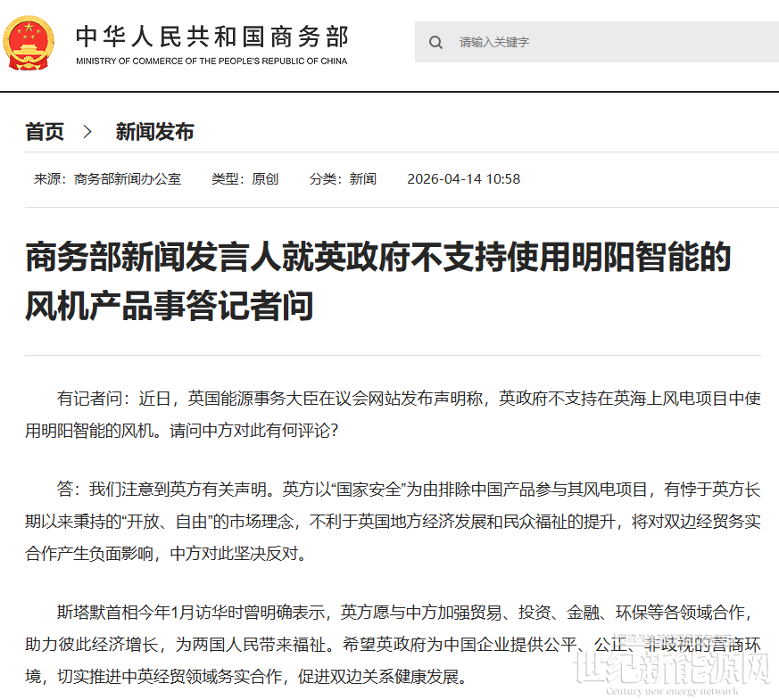 有记者问:近日,英国能源事务大臣在议会网站发布声明称,英政府不支持在英海上风电项目中使用明阳智能的风机。请问中方对此有何评论?