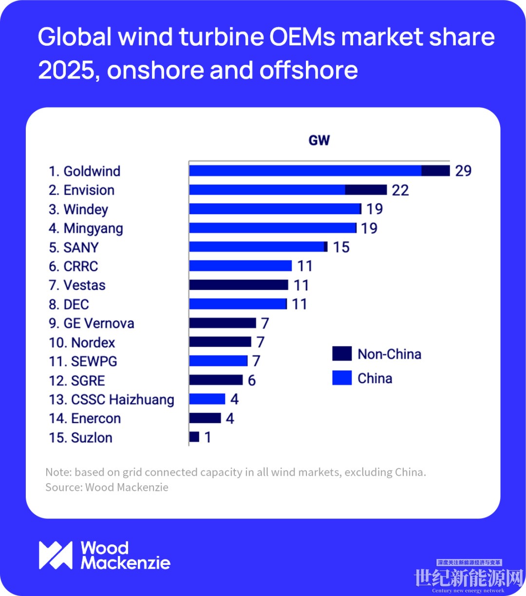 值得注意的是,2025年印度风电市场实现强势反弹,国内新增装机量近乎翻倍,本土企业装机量达2.7GW。苏司兰(Suzlon)重返全球排名前15位,其它印度整机制造商也跻身中国以外市场前十。