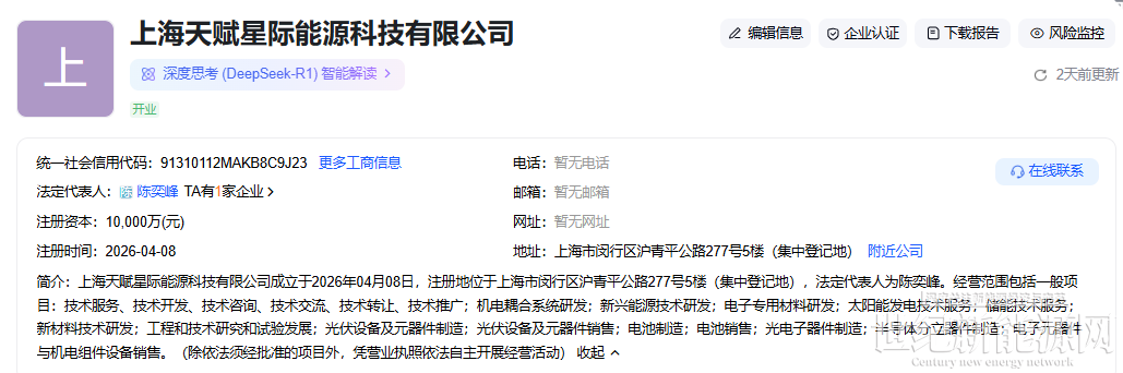 近日,爱企查显示,上海天赋星际能源科技有限公司成立,法定代表人为陈奕峰,注册资本1亿人民币,经营范围包括新兴能源技术研发、太阳能发电技术服务、储能技术服务、光伏设备及元器件制造等。