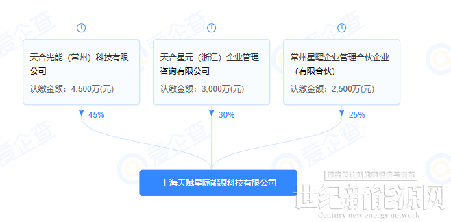 股权穿透显示,该公司由天合光能股份有限公司旗下天合光能(常州)科技有限公司、天合星元(浙江)企业管理咨询有限公司、常州星曜企业管理合伙企业(有限合伙)共同持股。