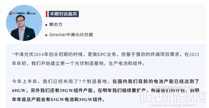2023年6月,中清光伏时任总裁蔡志方接受媒体采访时明确表示,2023年上半年,中清光伏已经布局了7个制造基地,在国内的电池产能已经达到了69GW,另外还有39GW组件产能。2024年中清光伏还要继续扩产,根据计划,到2024年底中清光伏会有83GW电池和39GW组件,总计122GW的总产能。