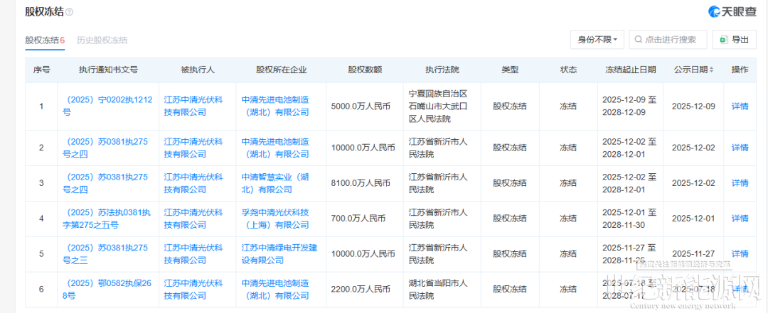 到了2025年,中清光伏的经营情况继续恶化。4月9日,中清光伏被湖州市吴兴区人民法院列为“失信被执行人”.自此开始,中清光伏“老赖”的标签再未摘掉。截止目前,据爱企查、天眼查等公开信息统计,中清光伏已被执行3.9亿元,还被冻结了3.6亿元的股权。