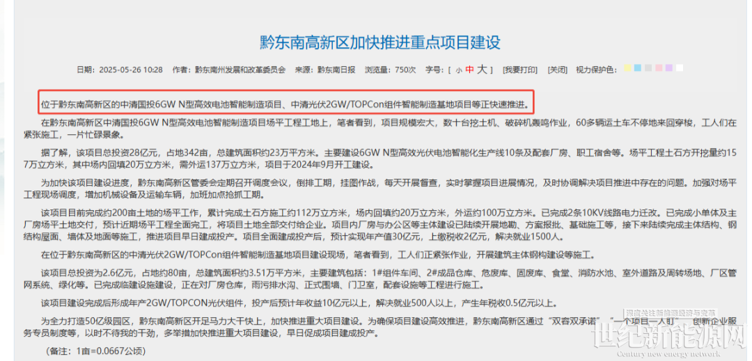 2024年4月11日,凯里市政府与中清集团签署了关于投资建设6GW光伏电池项目的合作框架协议,总投资30亿元。2024年9月,凯里6GW光伏项目开工建设,原预计2025年年底完工投产,后推迟至2026年一季度。