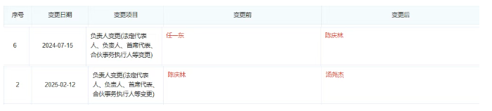 更具争议的是,中清光伏的法人代表在中清光伏债务危机爆发前开始火速且频繁的变更,2024年7月,法人先由任一东变更为陈庆林,2025年2月,法人又由陈庆林变更为汤尧杰。