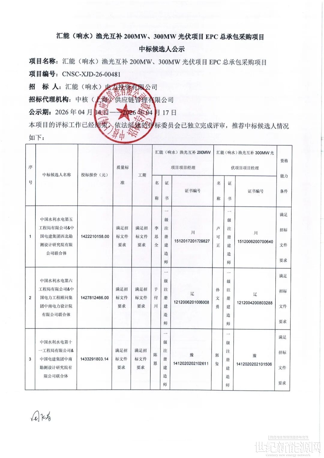 4月14日,汇能(响水)渔光互补200MW、300MW光伏项目EPC总承包采购项目中标候选人公示。