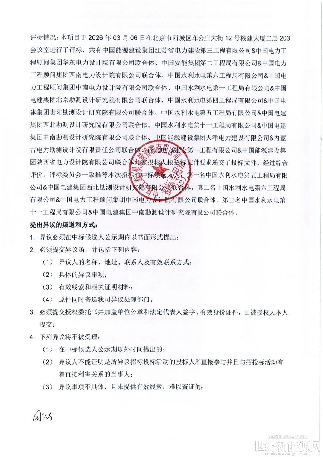 中国水利水电第五工程局有限公司&中国电建集团西北勘测设计研究院有限公司联合体、中国水利水电第六工程局有限公司&中国电力工程顾问集团中南电力设计院有限公司联合体、中国水利水电第十一工程局有限公司&中国电建集团中南勘测设计研究院有限公司联合体入围,投标单价2.385~2.404元/W。