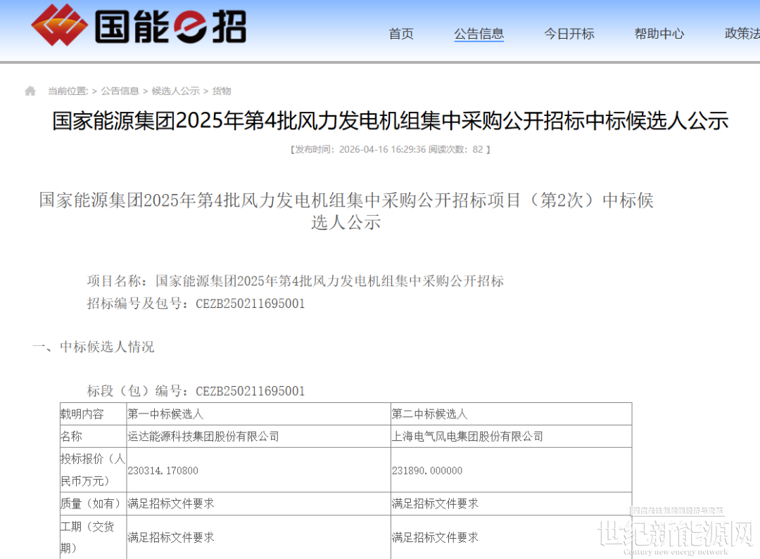 4月16日,国家能源集团2025年第4批风力发电机组集中采购公开招标项目(第2次)中标候选人公示,涉及风电规模1.16GW。根据公告,第一中标候选人为运达股份,投标报价为23.0314亿元,折合单价为1986元/kW。