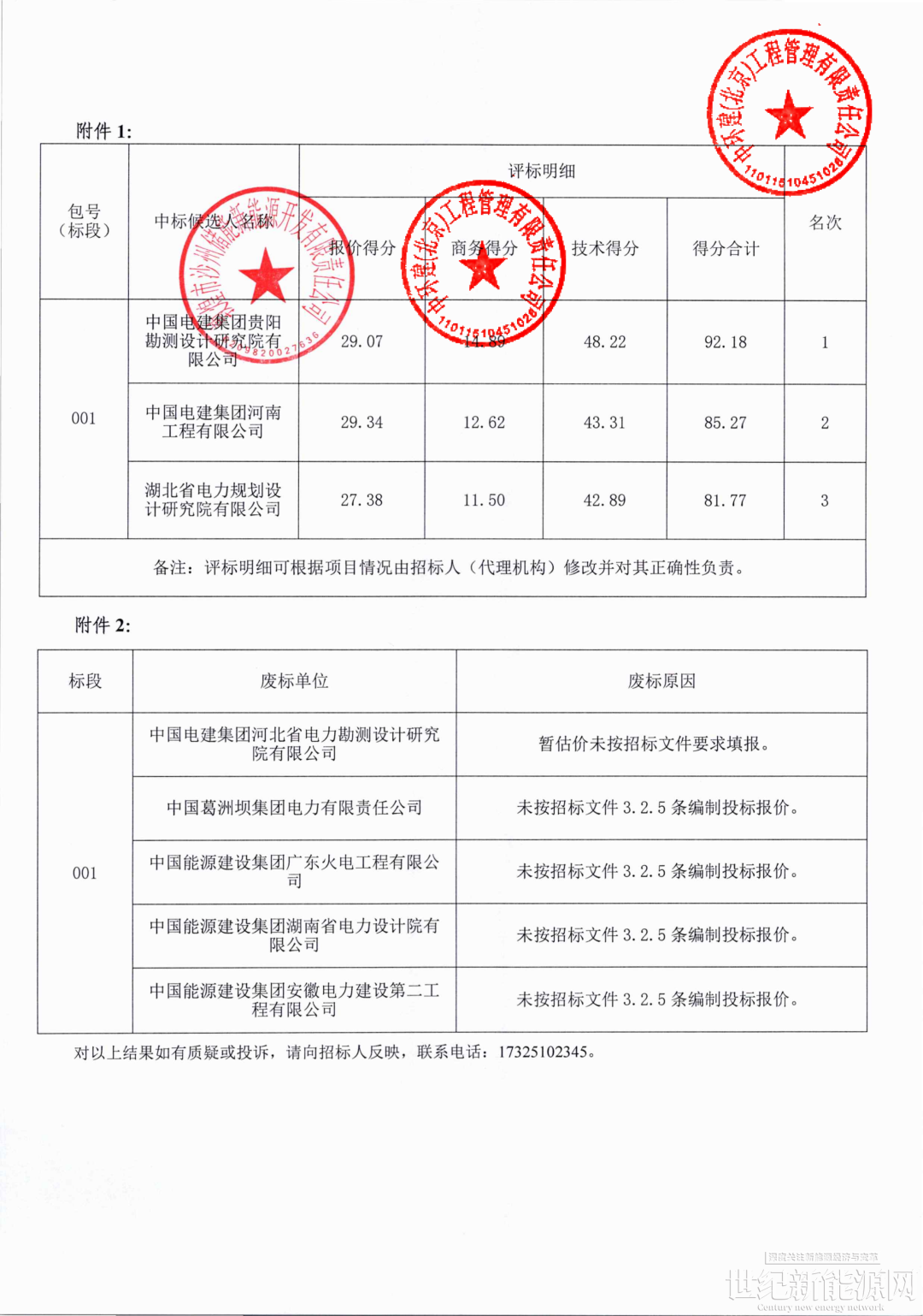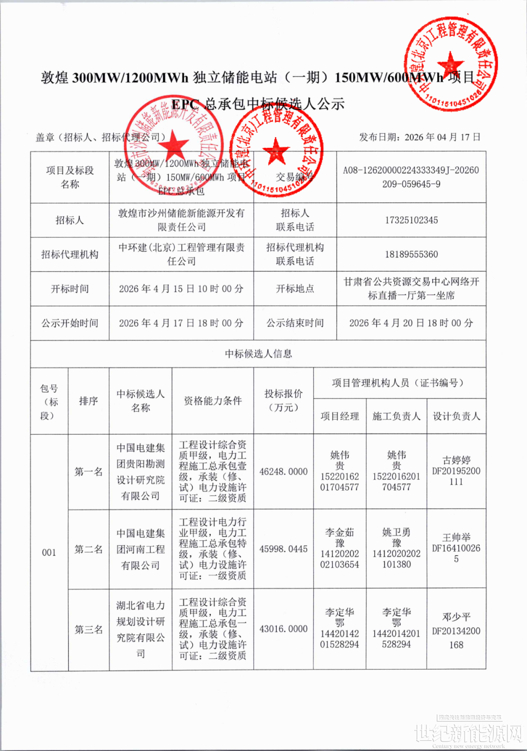 第一中标候选人为中国电建集团贵阳勘测设计研究院有限公司,投标报价为46248万元,折合单价0.7708元/Wh;