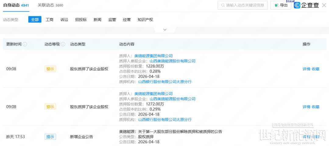 4月18日,企查查显示,美锦能源第一大股东美锦能源集团有限公司本次调整质押股份数量为2500万股,占公司总股本比例0.57%。调整后,累计质押股份数量为164612.159万股,占其所持股份比例100%,占公司总股本比例37.38%。