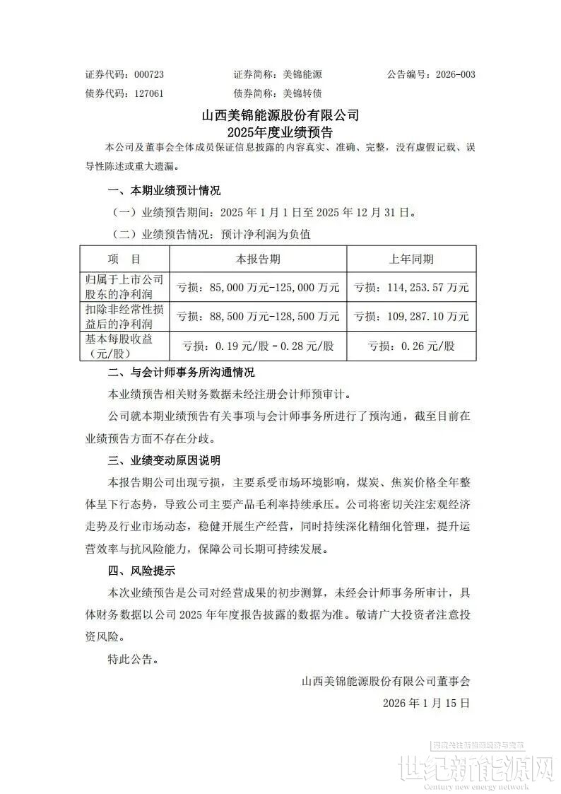 但目前来看并不乐观,山西美锦能源股份有限公司2025年年报显示,2025年预计净利润亏损8.5亿元至12.5亿元,扣非净利润亏损8.85亿元至12.85亿元。这也是美锦能源继2024年之后连续第二年出现净利润亏损。
