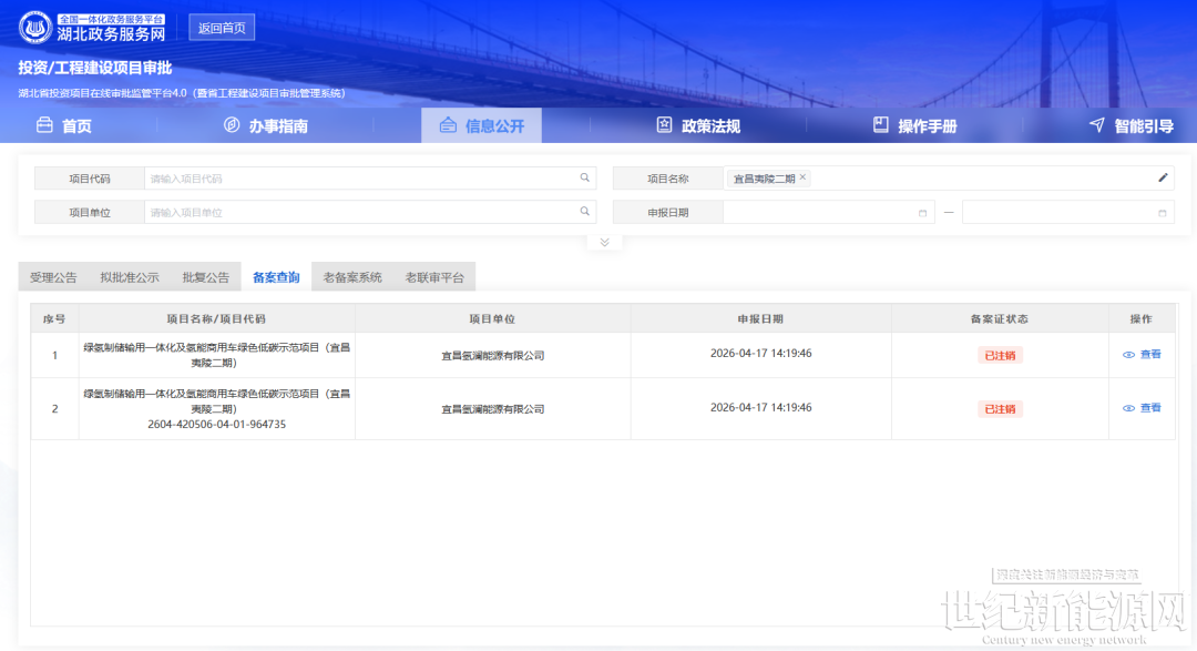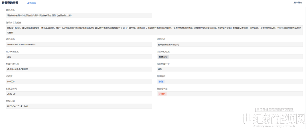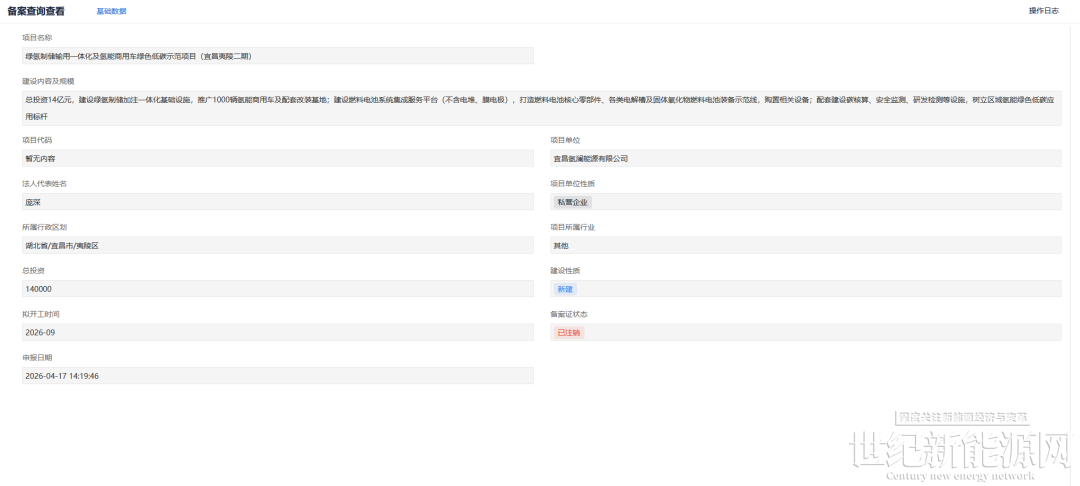 4月17日,湖北政务服务网发布绿氢制储输用一体化及氢能商用车绿色低碳示范项目(宜昌夷陵二期)备案注销信息。