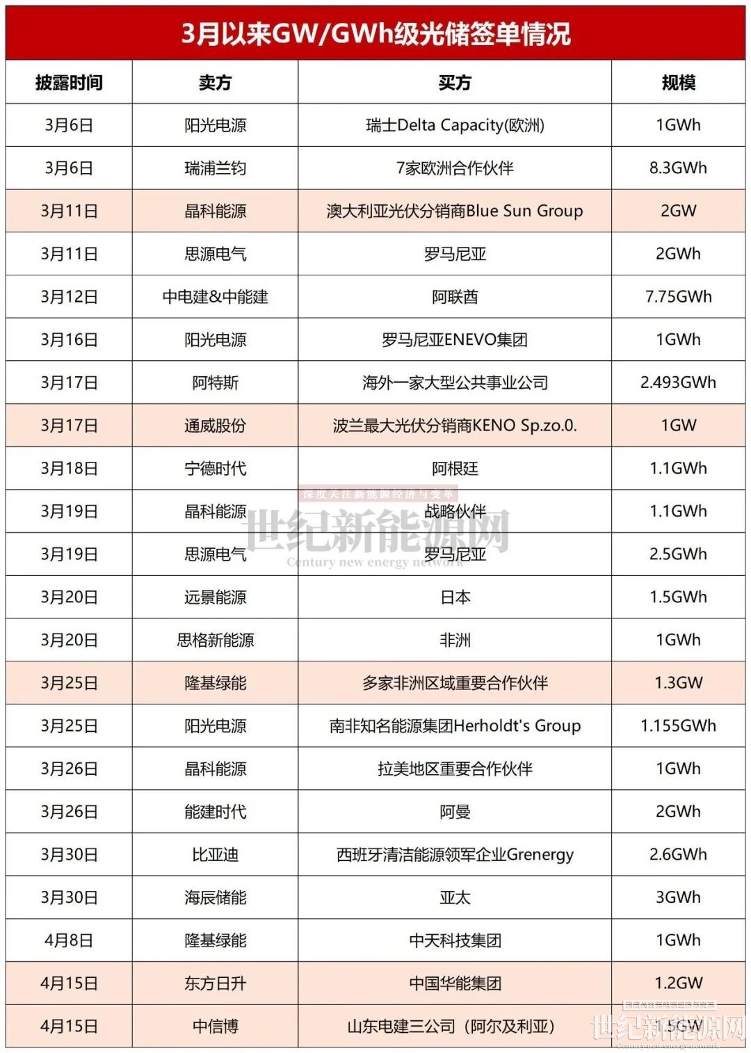 不止光伏GW级大单接连出现,3月以来,储能出海也迎来了“爆单”时刻,GWh级的大单数量更是远超光伏。据不完全统计,3月以来GW/GWh级光储签单情况如下: