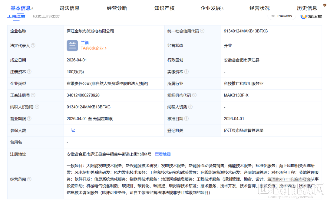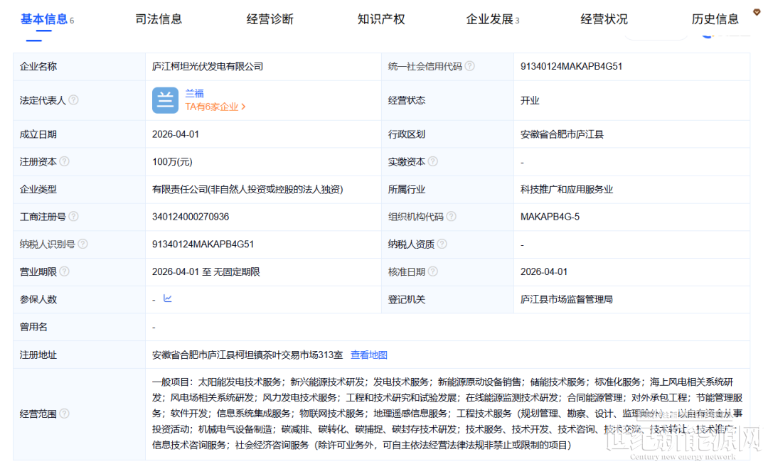 企查查工商信息显示,近日,国轩高科股份有限公司(简称“国轩高科”,002074.SZ)通过间接全资持股方式,同日成立两家光伏发电新公司——庐江柯坦光伏发电有限公司与庐江金能光伏发电有限公司。
