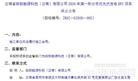 4月16日,云南省拓核能源科技(云南)有限公司2026年第一批分布式光伏发电EPC项目第三次宣布终止,原因为施工单位无法履行施工合同。