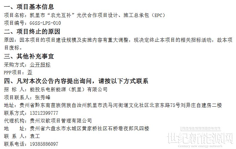 4月13日,贵州凯里市“农光互补”光伏合作项目设计、施工总承包(EPC)废标公告发布,因本项目的项目建设规模及实施内容有重大调整,现决定终止本项目的相关招标活动,故本项目废标。