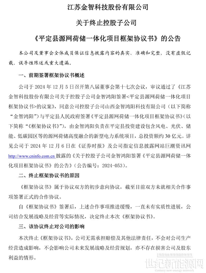 根据公告,该项目原计划由金智鸿阳在山西平定县投资建设一个包含风电、光伏、储能、低碳园区的“源网荷储”高度融合的新型电力系统,总投资规模高达约30亿元人民币。该框架协议曾于2024年12月5日经金智科技董事会审议通过。