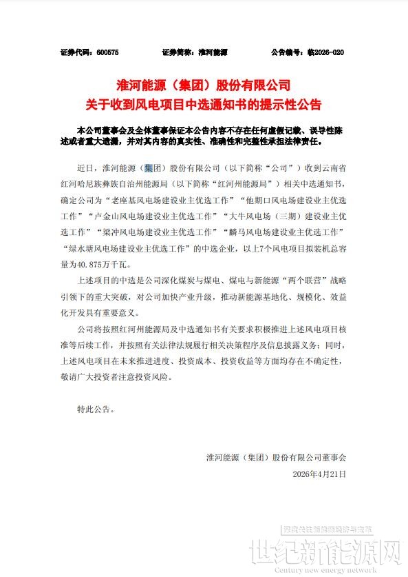 4月21日,淮河能源(集团)股份有限公司发布关于收到风电项目中选通知书的提示性公告。