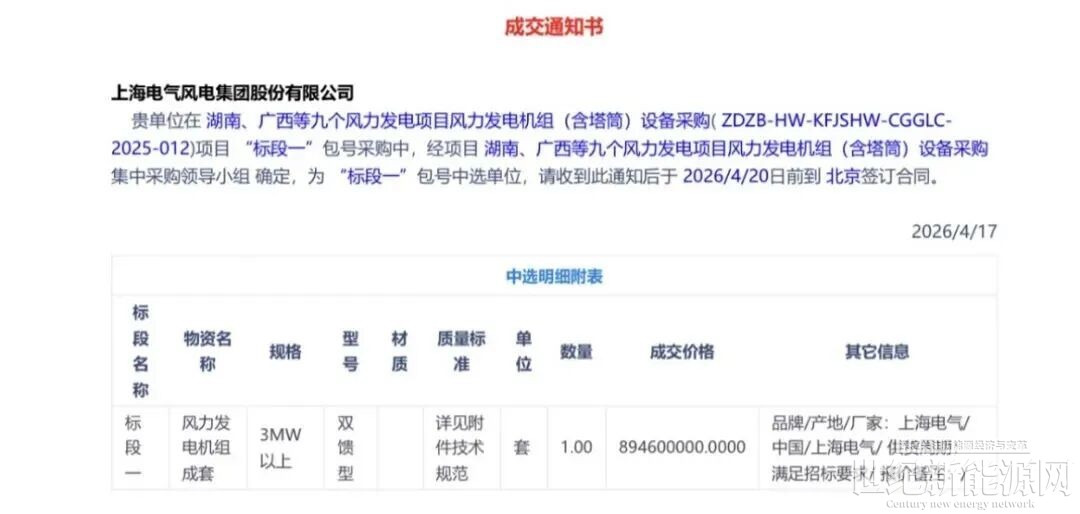 近日,中国能建湖南、广西等九个风力发电项目风力发电机组(含塔筒)设备采购中选结果公布,电气风电为标段一中选单位。