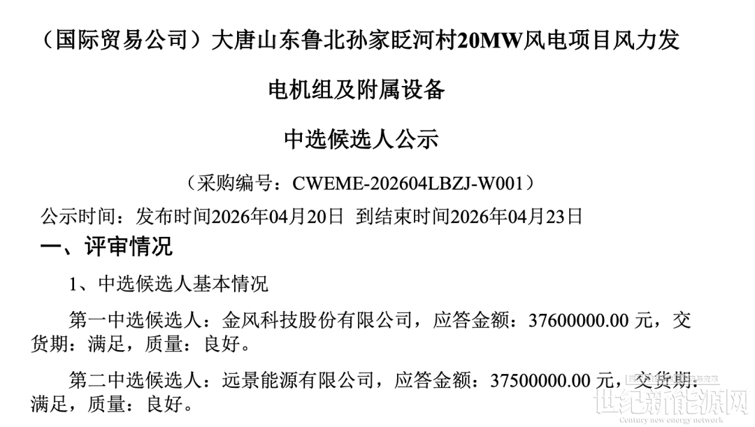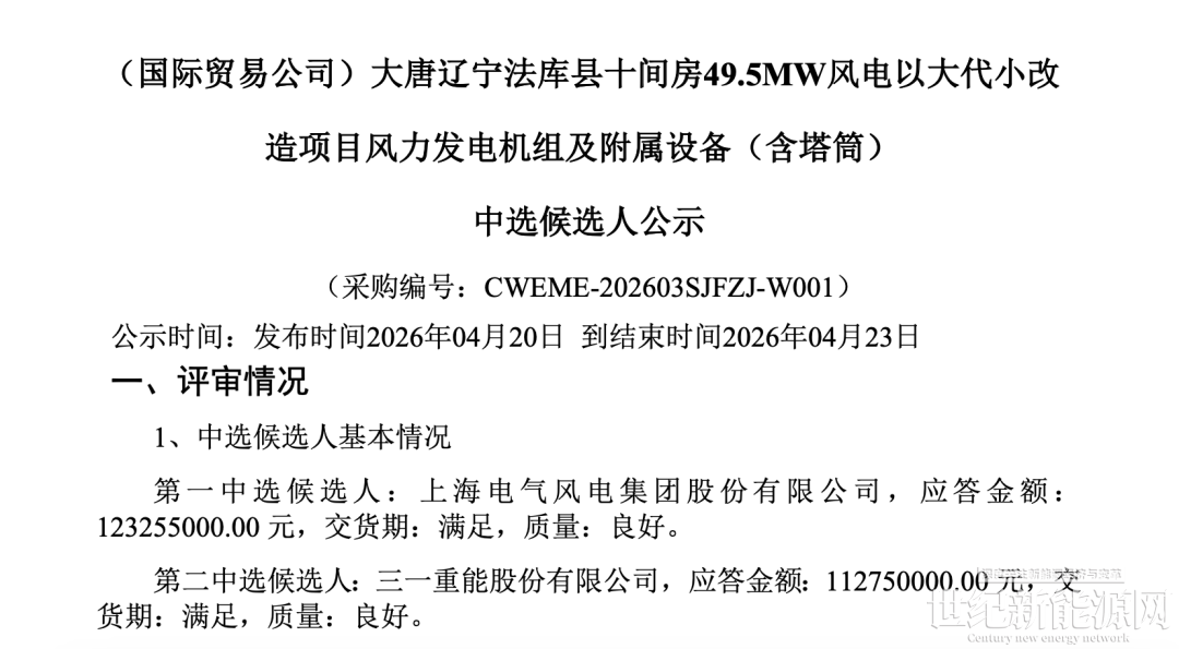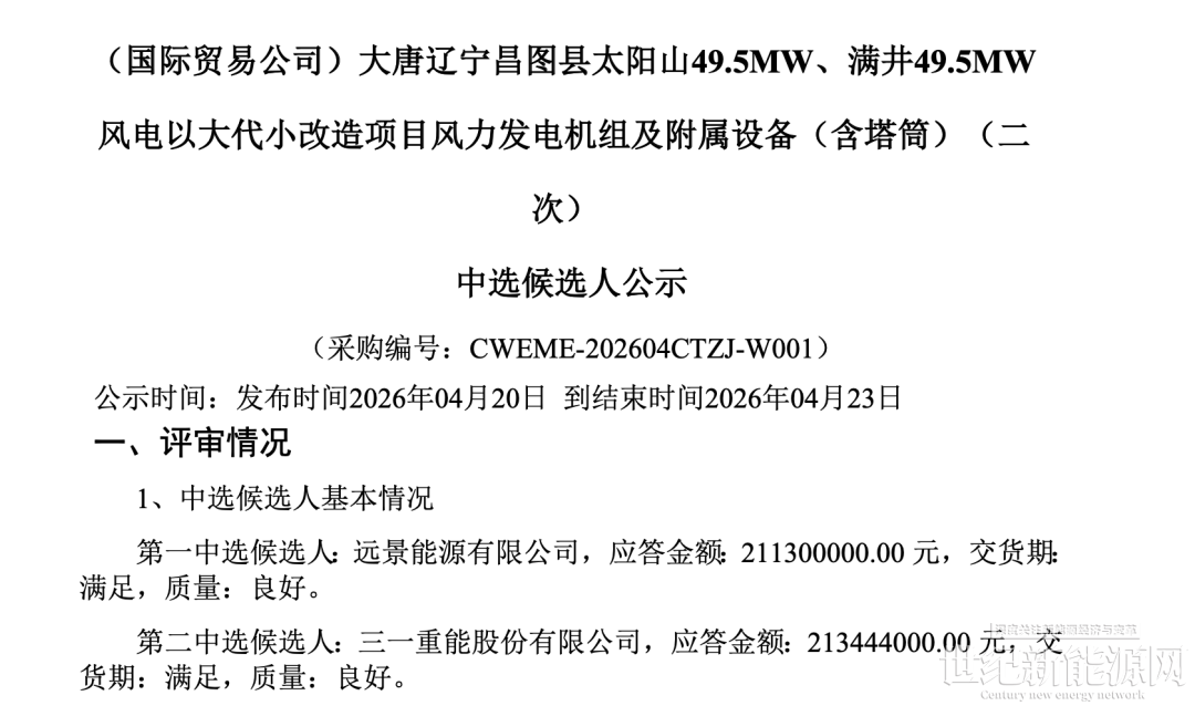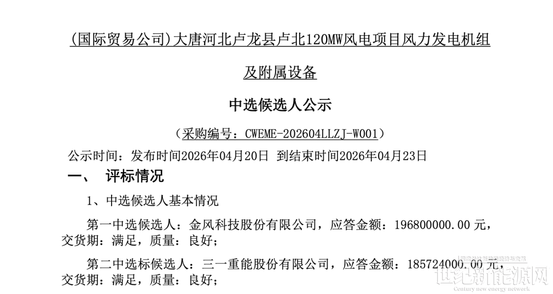 4月20日,大唐河北卢龙县卢北120MW风电项目、大唐山东鲁北孙家眨河村20MW风电项目、大唐辽宁法库县十间房49.5MW风电以大代小改造项目和大唐辽宁昌图县太阳山49.5MW、满井49.5MW风电以大代小改造项目风力发电机组及附属设备(含塔筒)(二次)中选候选人公示,规模共计288.5MW。金风科技预中标140MW,电气风电预中标49.5MW,远景能源预中标99MW。