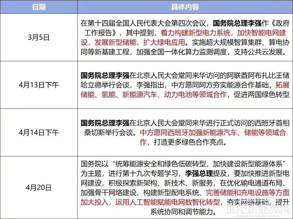 短短两个月内,国务院总理李强先后四次就储能工作作出重要指示。从3月5日政府工作报告中的“发展新型储能”,到4月13日、14日接连与阿联酋、西班牙领导人会谈时强调储能合作,再到4月20日国务院专题学习上要求“完善储能和充电设施”,这般高频次的点名,实属罕见。