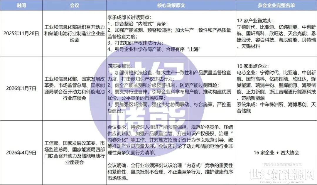2025年11月到2026年4月,工信部、发改委、市场监管总局、国家能源局连续三次召开动力及储能电池行业座谈会。主题高度统一:治理“内卷式”竞争、合理有序“出海”。4月9日的会议甚至讨论了“非理性竞争负面行为清单”,从“价格战”到知识产权侵权等,一一列入。