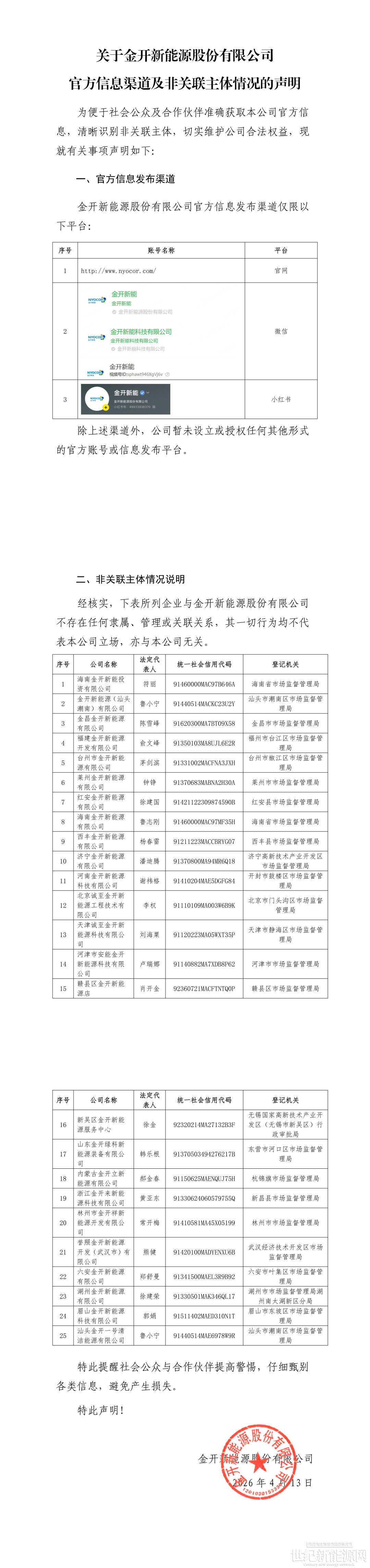 近日,金开新能科技有限公司官微发布声明,公示了公司3个官方信息发布渠道;同时列明25家公司名称中含“金开新能源”字样,实则与公司无任何隶属及关联关系的企业主体,提醒公众与合作伙伴提高警惕,避免产生损失。