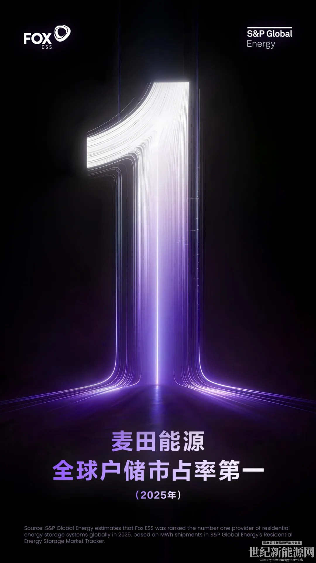 根据标普全球(S&P Global Energy)最新数据,麦田能源获得全球户用储能市占率第一(2025年)。