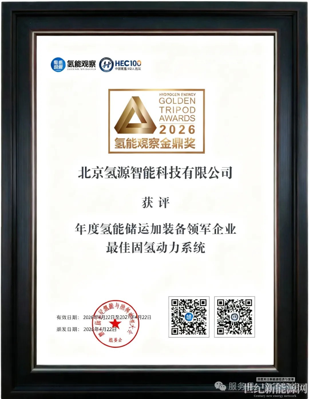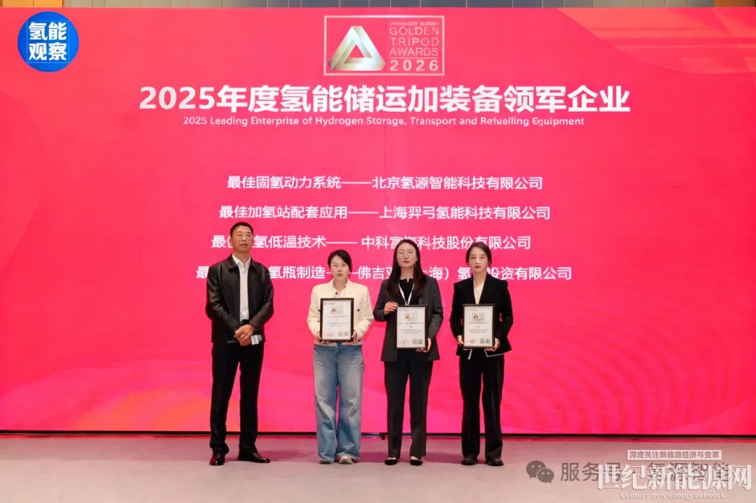 近日,2026氢能观察金鼎奖(Golden Tripod Awards)评选结果正式揭晓,北京氢源智能科技有限公司凭借在固态储氢动力系统领域的技术积累、产品落地及产业化实践,获得「2025年度氢能储运加装备领军企业——最佳固氢动力系统」荣誉。