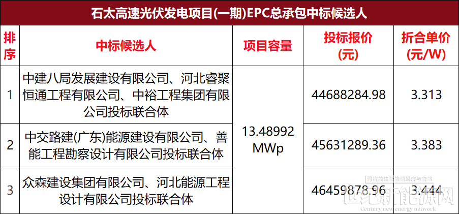 4月22日,石太高速光伏发电项目(一期)EPC总承包中标候选人公示,其中: