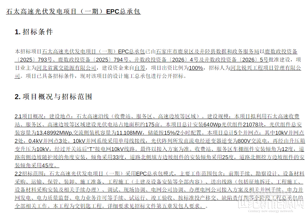 招标范围:石太高速光伏发电项目(一期)采用EPC总承包模式,为交钥匙工程。