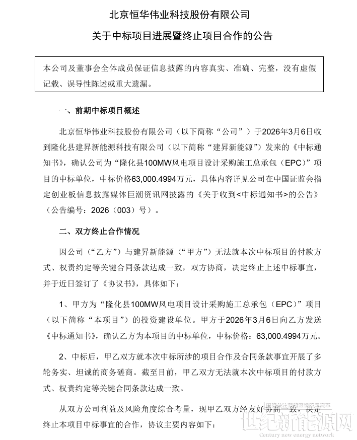 4月21日,北京恒华伟业科技股份有限公司发布关于中标项目进展暨终止项目合作的公告。公告显示,北京恒华伟业科技股份有限公司于2026年3月6日收到隆化县建昇新能源科技有限公司(简称“建昇新能源”)发来的《中标通知书》,确认公司为“隆化县100MW风电项目设计采购施工总承包(EPC)”项目的中标单位,中标价格63,000.4994万元。