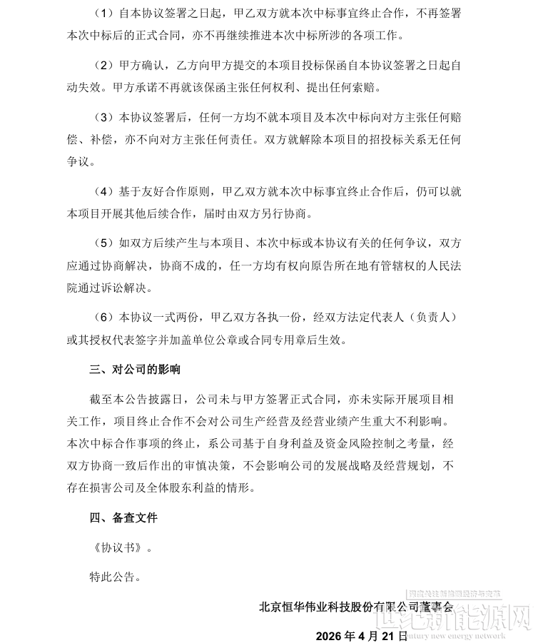因恒华科技与建昇新能源无法就本次中标项目的付款方式、权责约定等关键合同条款达成一致,双方协商,决定终止上述中标事宜,并于近日签订了《协议书》。