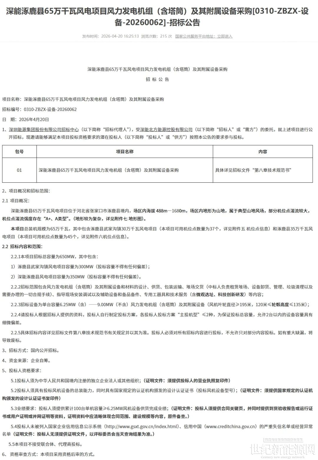 4月20日,深能涿鹿县65万千瓦风电项目风力发电机组(含塔筒)及其附属设备采购招标公告发布。公告显示,深能涿鹿县65万千瓦风电项目位于河北省张家口市涿鹿县境内,本项目总装机规模为65万千瓦,其中包含涿鹿县武家沟镇30万千瓦风电项目(本项目可用机位点数量为37个)和涿鹿县35万千瓦风电项目(本项目可用机位点数量为45个)。