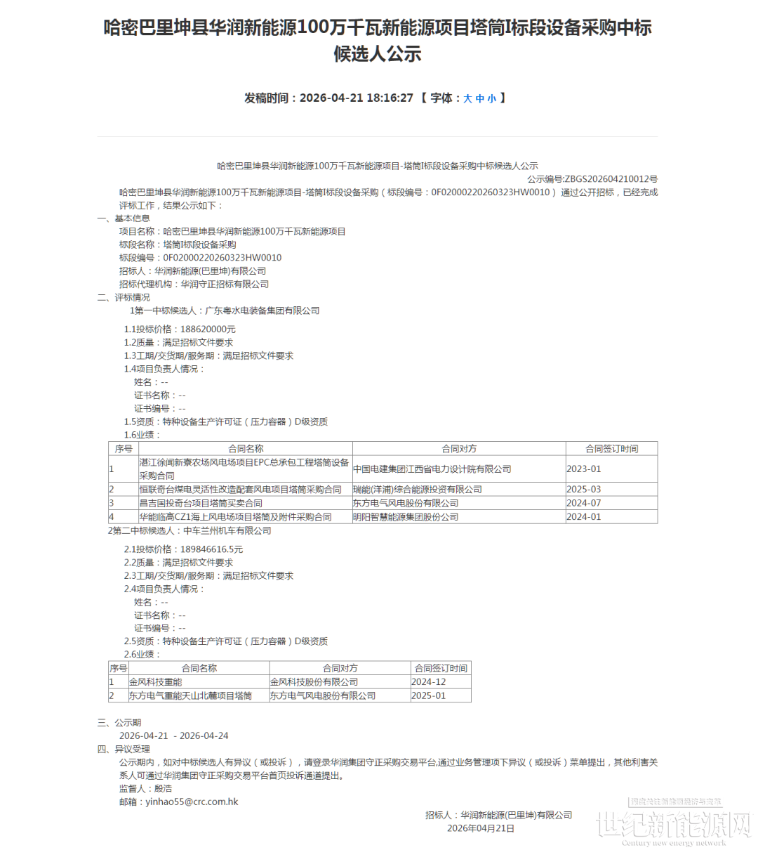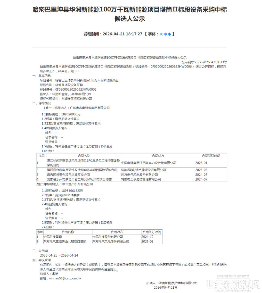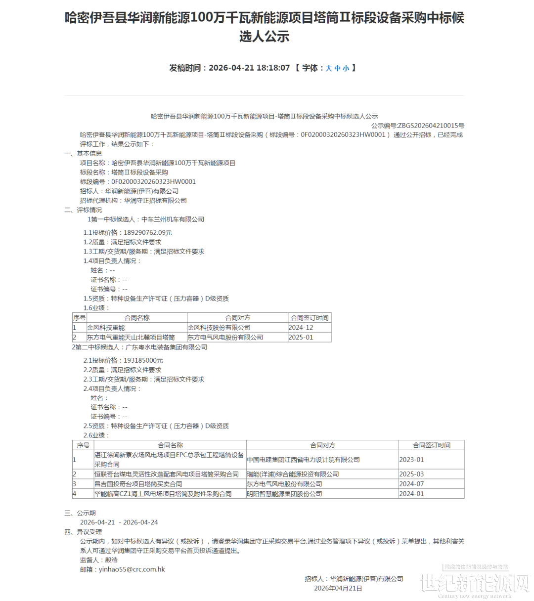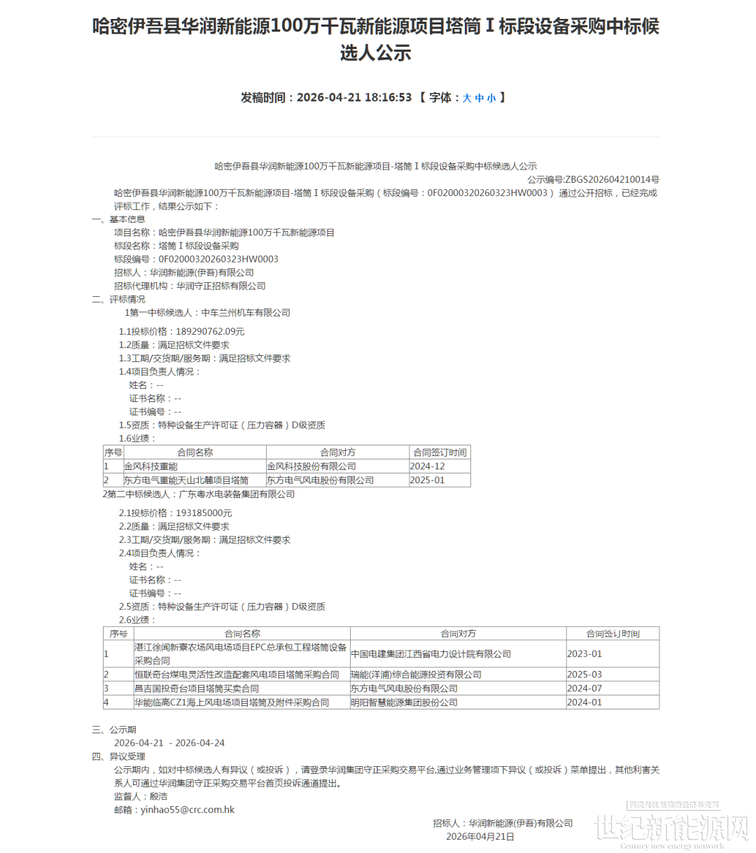 根据公示显示,广东粤水电装备集团有限公司预中标哈密巴里坤县华润新能源100万千瓦新能源项目;中车兰州机车有限公司预中标哈密伊吾县华润新能源100万千瓦新能源项目。
