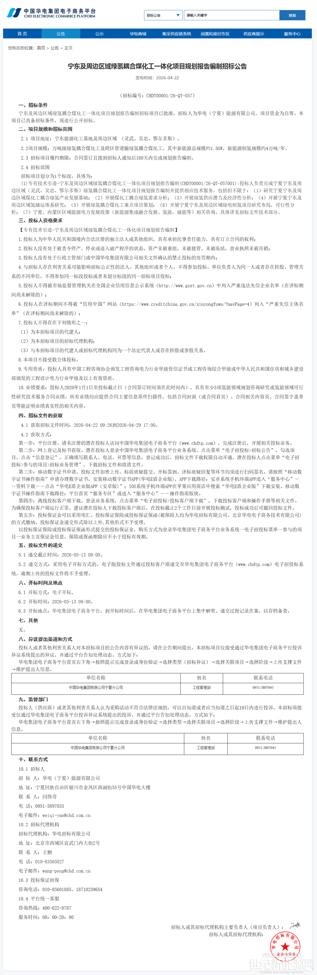 4月22日,宁东及周边区域绿氢耦合煤化工一体化项目规划报告编制招标公告。