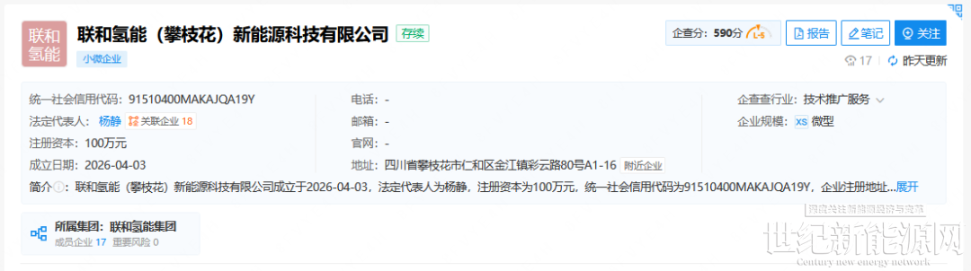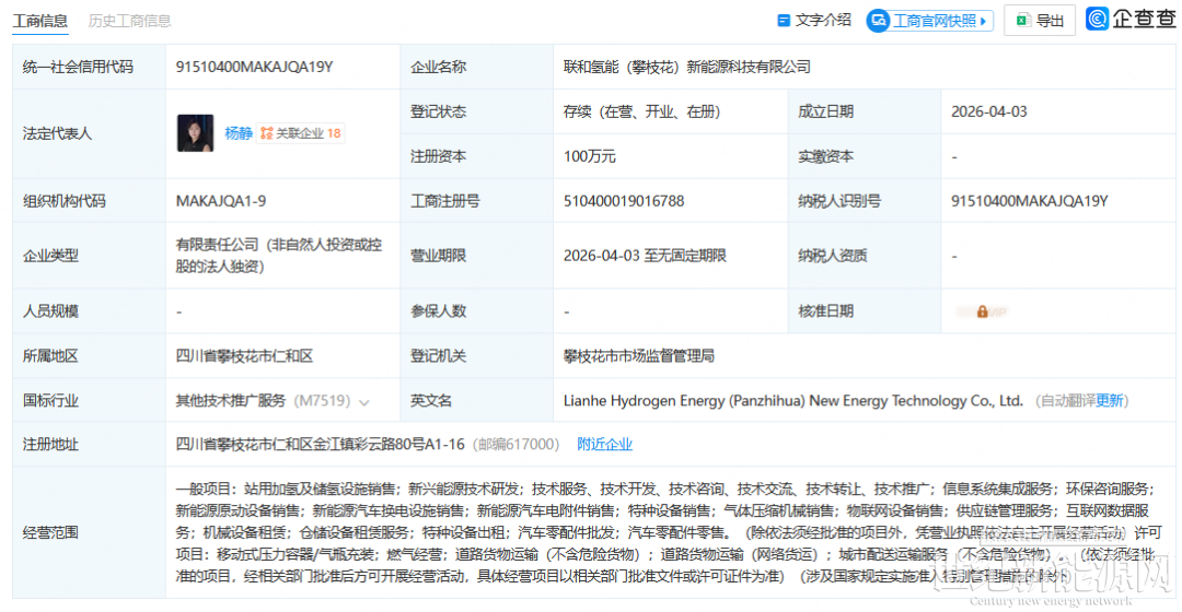 4月3日,联和氢能(攀枝花)新能源科技有限公司成立,法定代表人杨静,注册资本100万元。