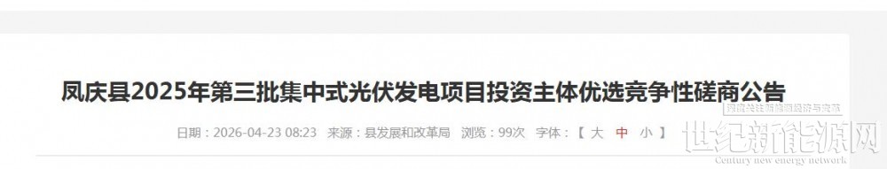 4月23日,云南省临沧市凤庆县2025年第三批集中式光伏发电项目投资主体优选竞争性磋商公告发布。
