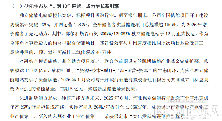 2025年,在储能电站项目的需求带动下,该企业储能系统产品交付规模达到3.66GWh,同比增长1729.38%。项目落地方面,公司独立储能电站在全国范围内全面推进,开工建设规模累计突破4GWh,并网运营1.8GWh,全年储备各类型储能项目总规模超15GWh,为2026年增长储备了充足动力。