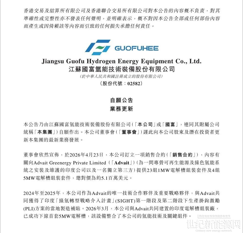于2026年4月23日,公司订立一项销售合约,内容有关向Advait Greenergy Private Limited提供23组1MW电解槽组装套件及4组5MW电解槽组装套件,总对价为约510万美元。