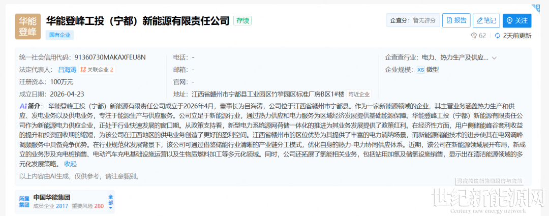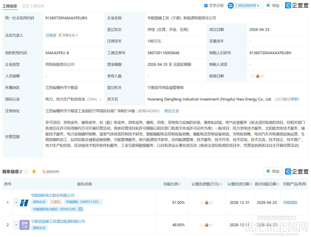 4月24日,华能登峰工投(宁都)新能源有限责任公司成立,注资100万,法定代表人吕海涛。