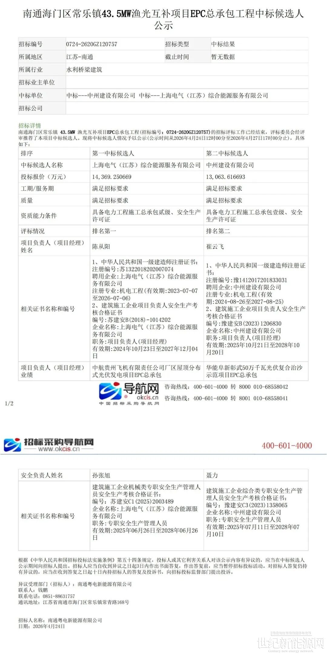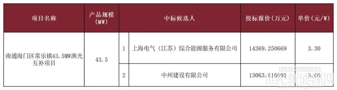 4月24日,南通海门区常乐镇43.5MW渔光互补项目EPC总承包中标候选人公示,其中: