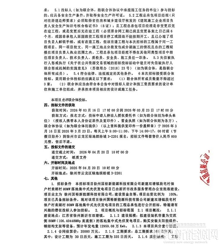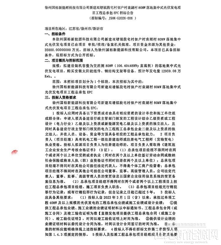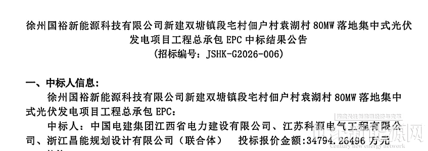 近日,徐州国裕新能源科技有限公司新建双塘镇段宅村佃户村袁湖村80MW落地集中式光伏发电项目工程总承包EPC中标结果公示,其中: