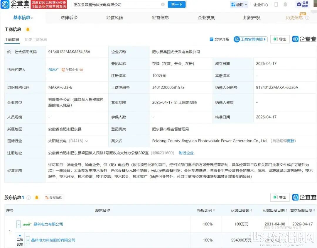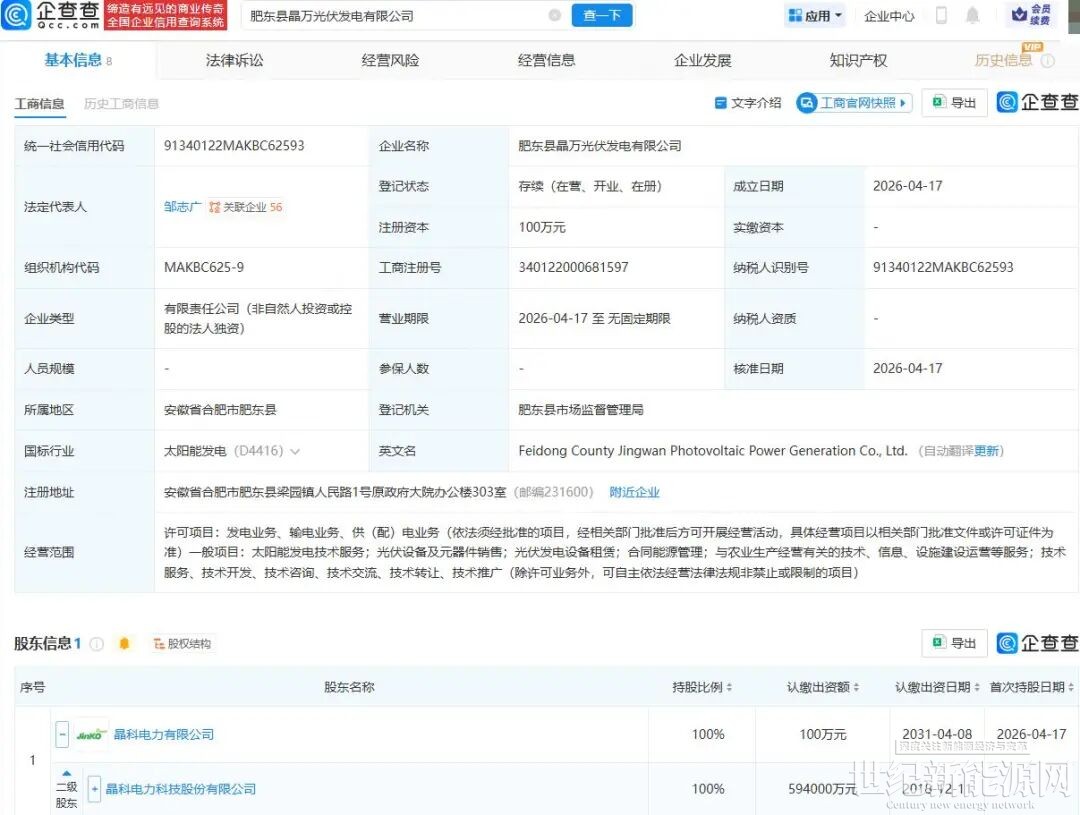 近日,肥东县晶园光伏发电有限公司、肥东县晶万光伏发电有限公司成立,法定代表人均为邹志广,经营范围均包含:发电业务、输电业务、供(配)电业务;太阳能发电技术服务;光伏设备及元器件销售等。