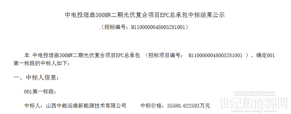 4月24日,山西【中电投垣曲300MW二期光伏复合项目EPC总承包】中标结果公示。