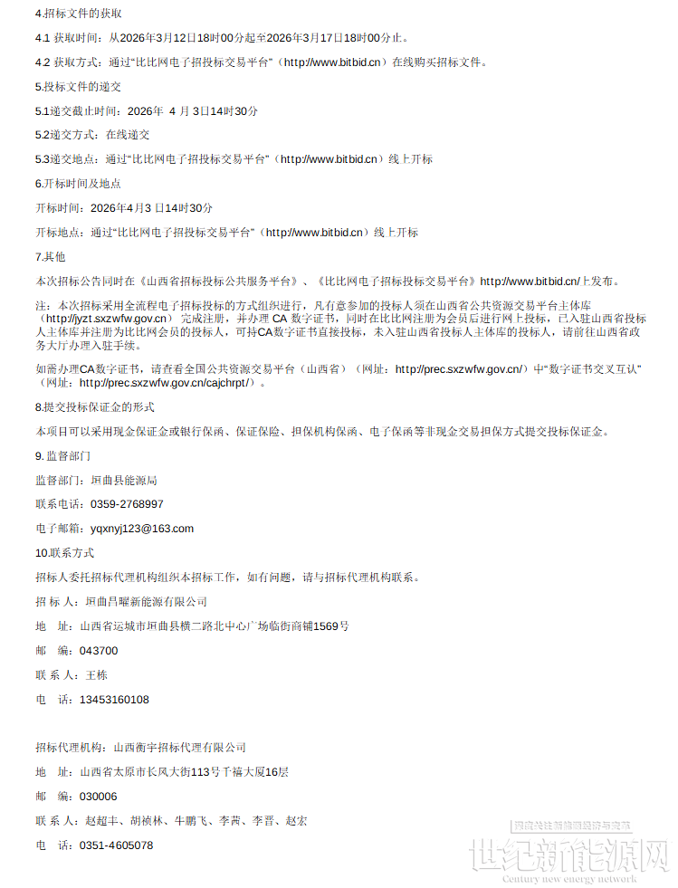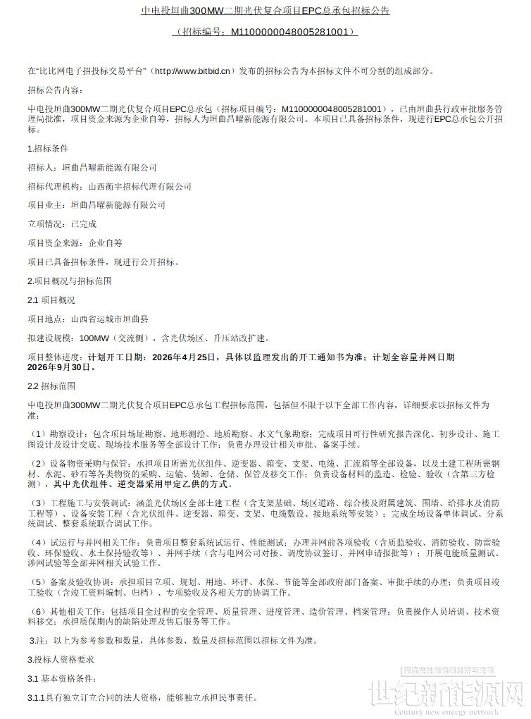 据悉,项目招标人为垣曲昌曜新能源有限公司,项目地点位于山西省运城市垣曲县。