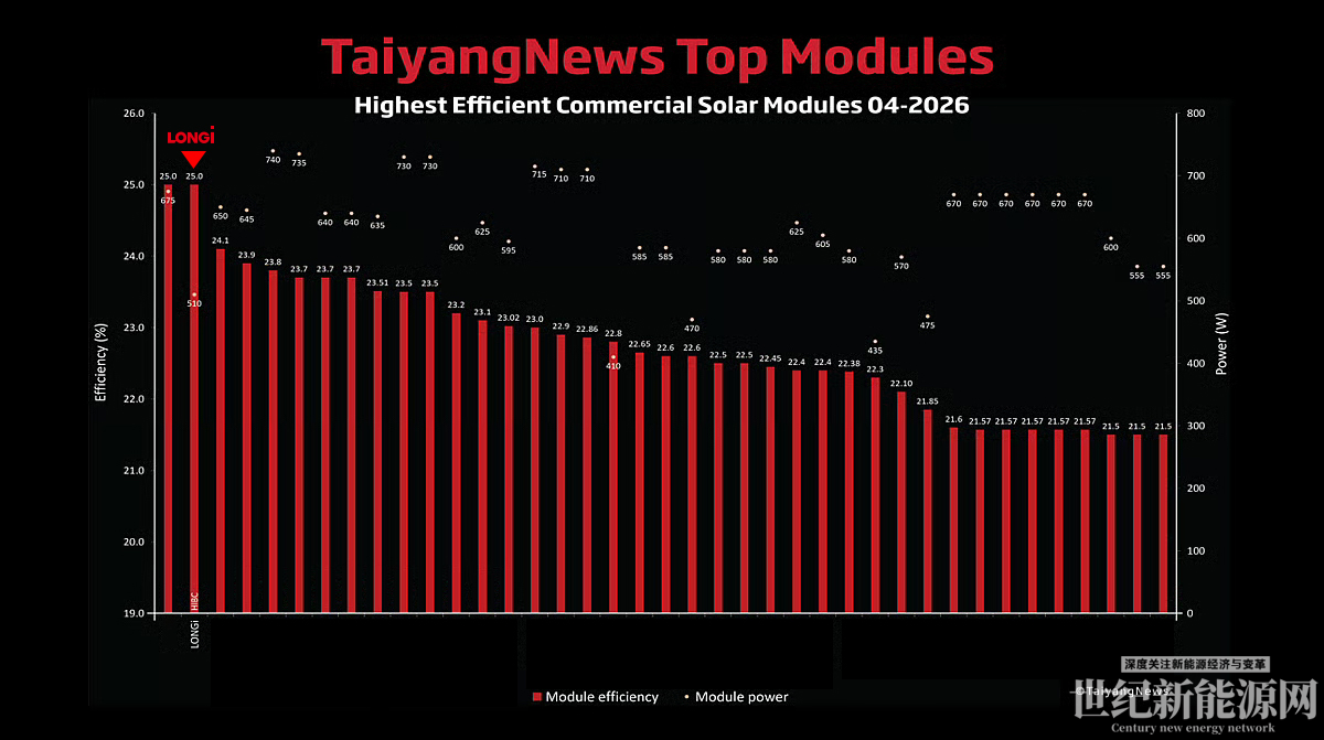 近日,全球权威光伏媒体TaiyangNews正式发布2026年4月版商业化量产组件效率榜单,隆基绿能基于HIBC技术打造的EcoLife系列组件以25%的量产效率强势登顶榜首,标志着隆基在BC技术路线的创新实力再获国际认可,全面引领光伏组件效率迈入“25%+”新时代。