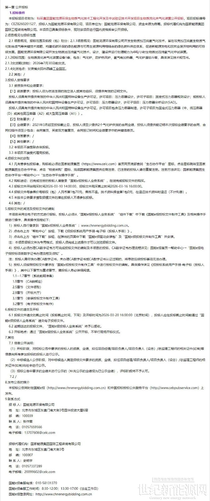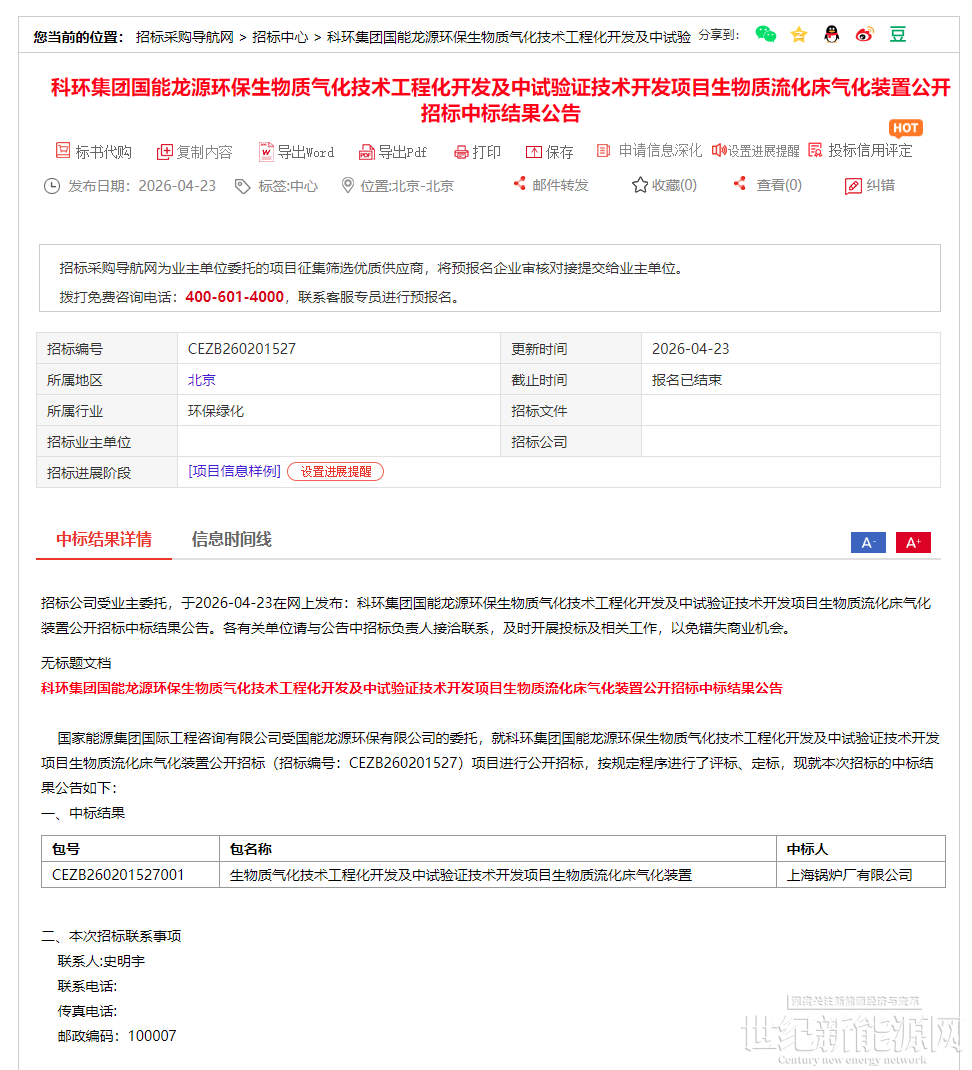 近日,科环集团国能龙源环保生物质气化技术工程化开发及中试验证技术开发项目生物质流化床气化装置公开招标中标结果公告:
