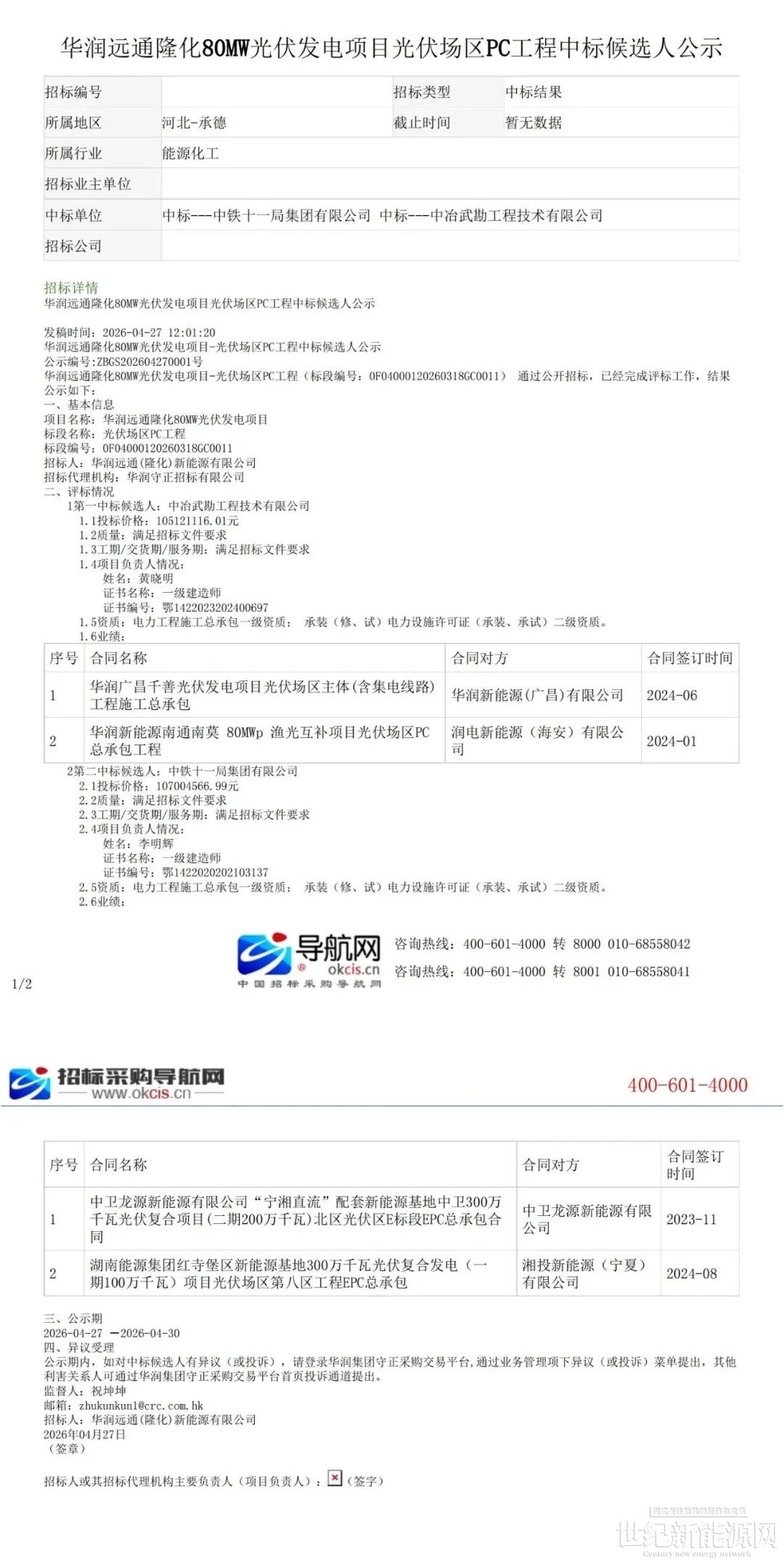4月27日,华润远通隆化80MW光伏发电项目PC总承包中标结果公示。