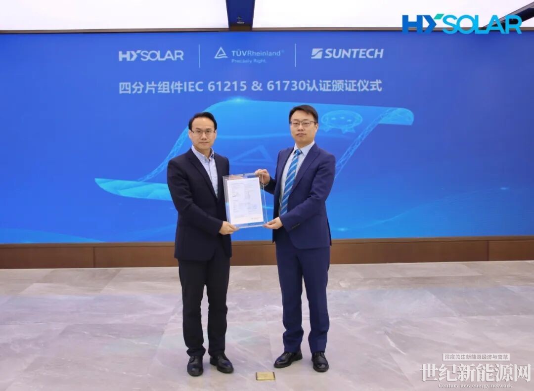 日前,弘元绿能自主研发的 HT 3.0四分片组件荣获国际权威第三方检测认证机构德国莱茵 TÜV 大中华区(以下简称“TÜV莱茵”)颁发的 IEC 61215与 IEC 61730双认证证书,标志着产品在安全合规与可靠性能上全面达到国际领先标准。TÜV 莱茵大中华区光伏产品服务副总经理周学伟先生与弘元绿能首席营销官曹晓荣先生共同出席授证仪式。